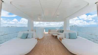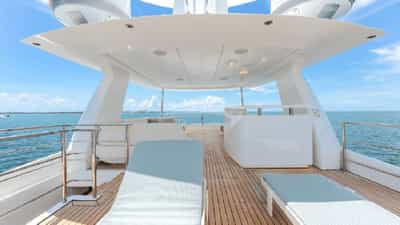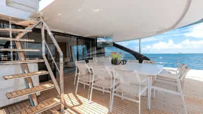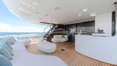 Amenities on board for the charter guests include Air Conditioning, BBQ, Outdoor shower, Indoor audio system, Jacuzzi on deck, Satellite TV, Stabilizers At Anchor, Swim platform, TV saloon and Wi-Fi.