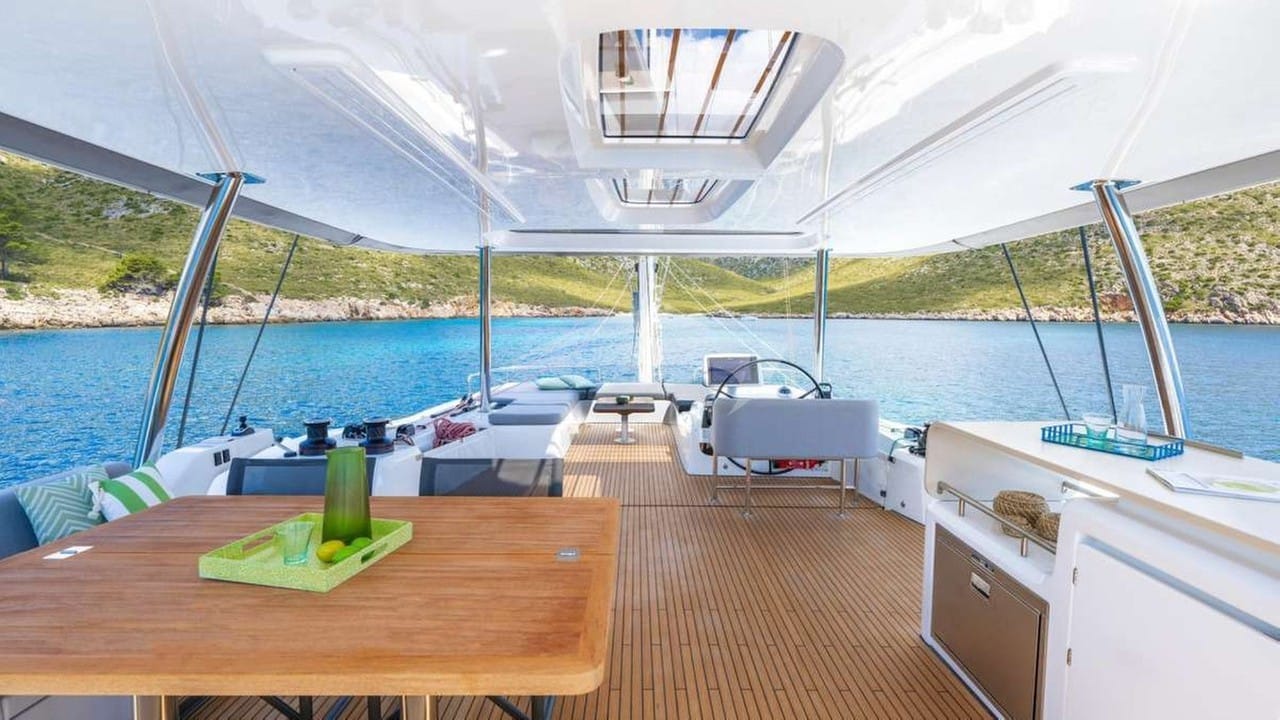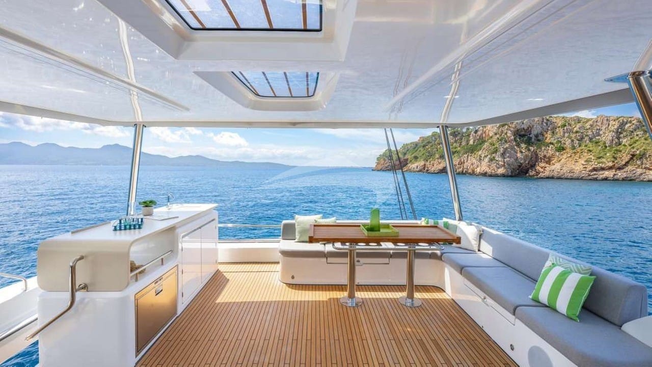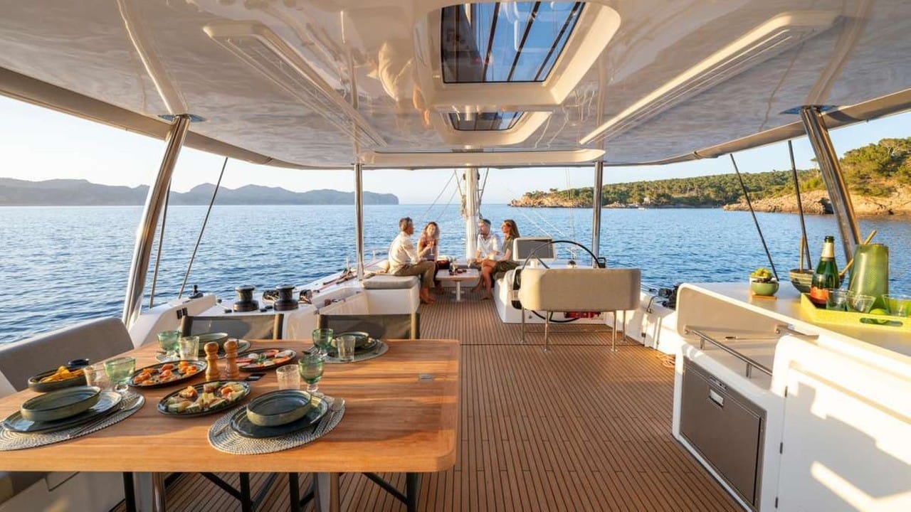 Amenities on board include Air Conditioning, BBQ, Outdoor shower, Indoor audio system, iPod dock, Swim platform, TV saloon and Wi-Fi.