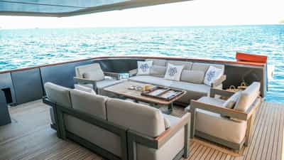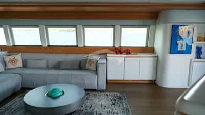 Amenities on board for the charter guests include Air Conditioning, BBQ, Outdoor shower, Indoor audio system, iPod dock, Satellite TV, Swim platform, TV saloon and Wi-Fi.