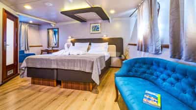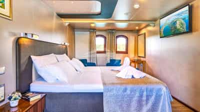 The guest cabins comprise a primary suite with a double bed , 12 cabins with a double bed , 12 cabins with a single bed and 5 cabins with a twin bed .