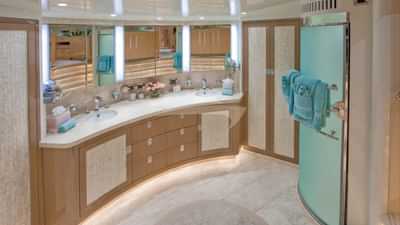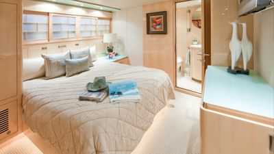 The guest cabins comprise a primary suite with a king size bed and en-suite bathroom facilities located on the deck, a VIP suite with a king size bed and en-suite bathroom facilities, 2 cabins with a queen size bed and en-suite bathroom facilities and a cabin with a twin bed and en-suite bathroom facilities.