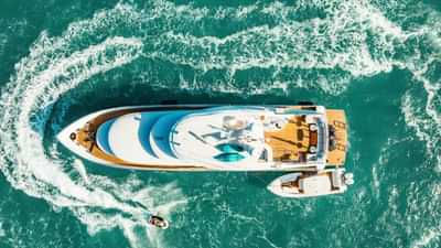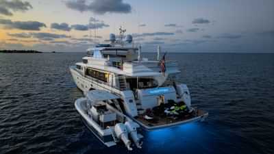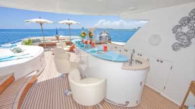 Amenities on board for the charter guests include Air Conditioning, BBQ, Bow Thruster, Movie Theater, Coffee machine, Outdoor shower, Games console, Ice maker, Indoor audio system, iPod dock, Jacuzzi on deck, Local TV, Outdoor audio system, Outdoor Bar, Satellite TV, Stabilizers, Starlink Satellite Internet, Sun loungers, Swim platform, TV all cabins, TV primary cabin, TV outdoor, TV saloon, Water maker and Wi-Fi.