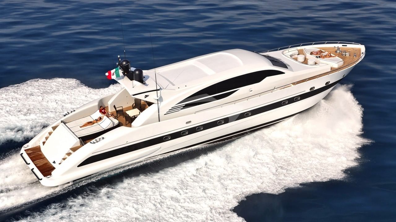 Amenities on board for the charter guests include Air Conditioning, Indoor audio system, Satellite Communications, Satellite TV, Sun pads, Sun loungers, Swim platform and Wi-Fi.