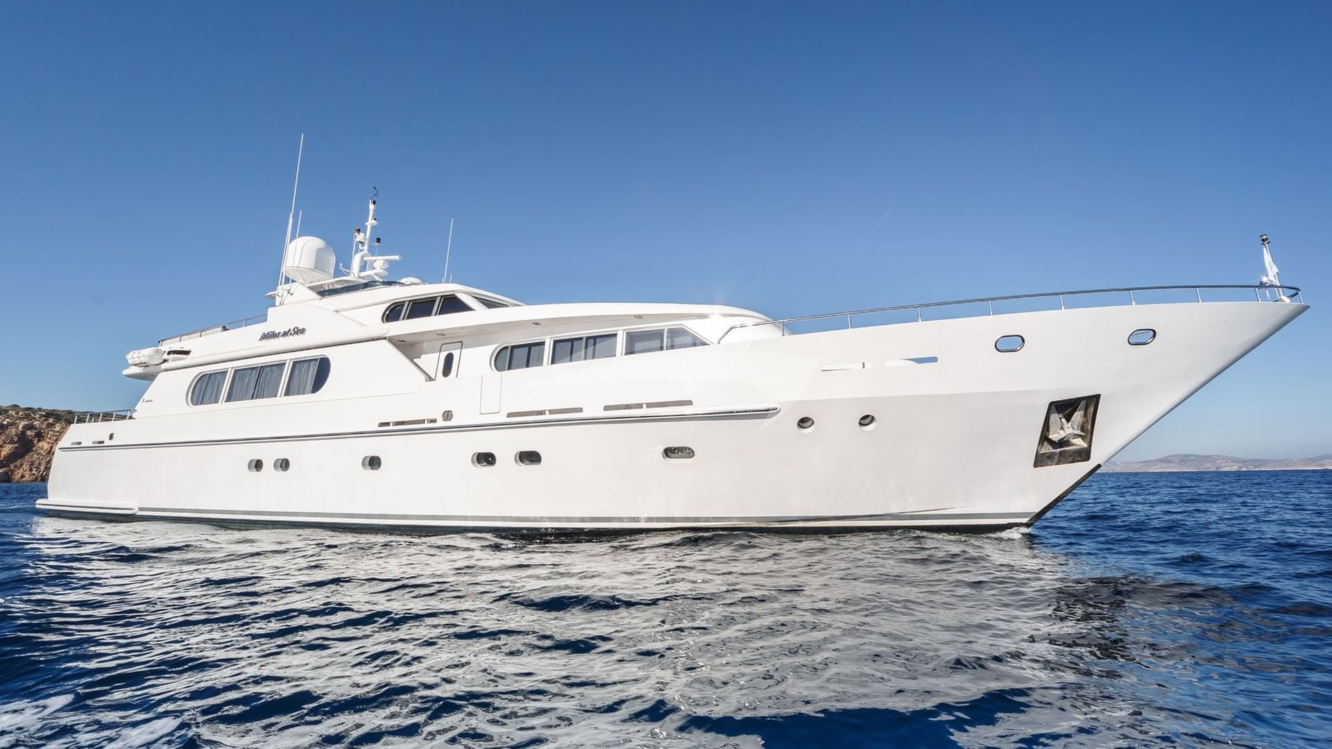 The 115ft / 35m MILOS AT SEA has been constructed with a steel hull and is powered by 2 X Caterpillar 1100hp with a cruising speed of 12 knots and a top speed of 15 knots.