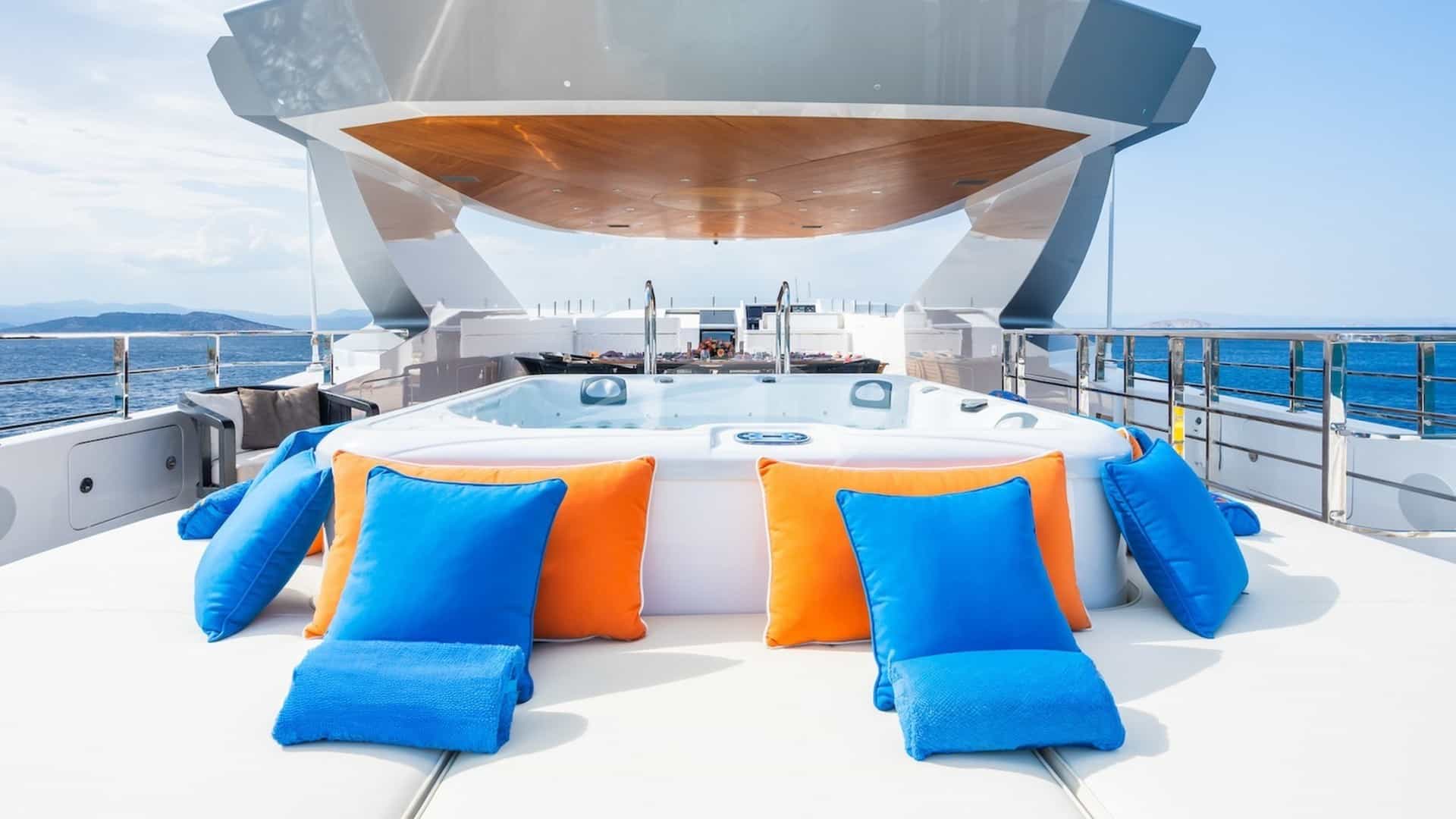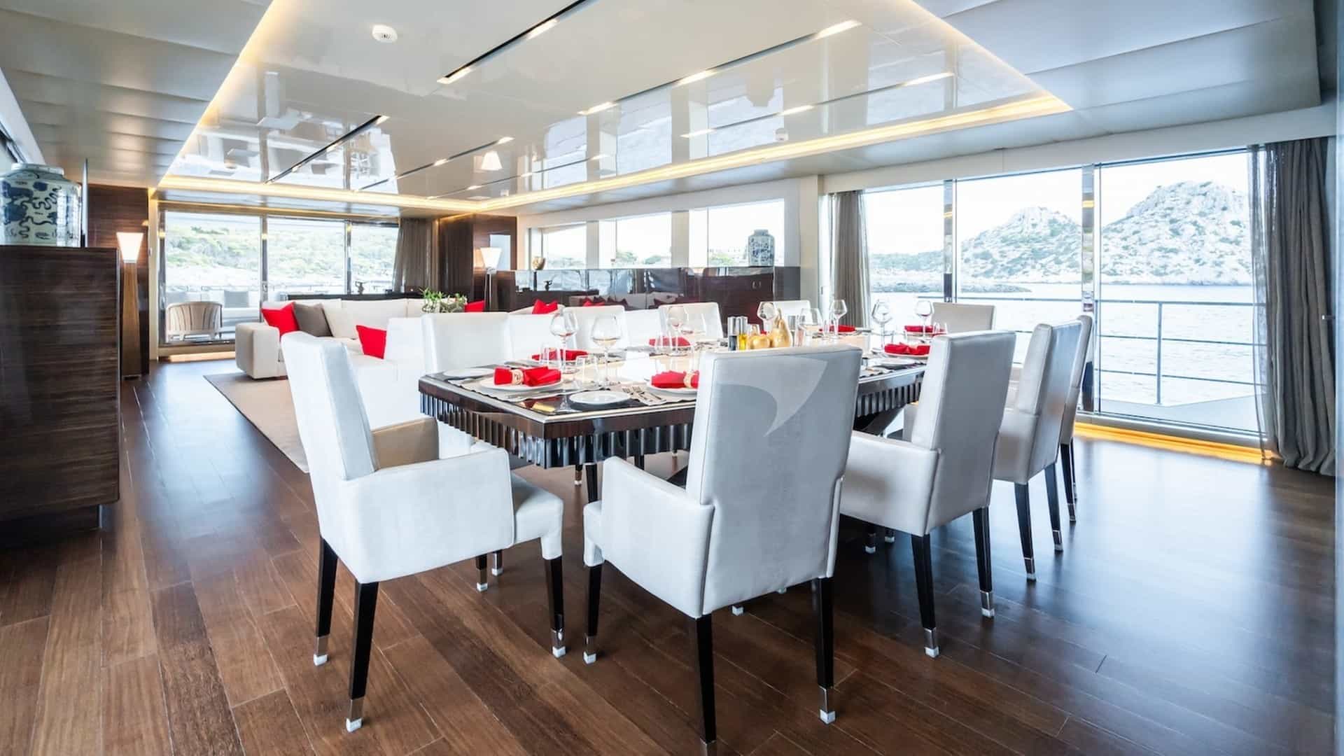 The yacht's expansive flybridge includes a large Jacuzzi, sunbathing area, and a large teak dining table for 10 guests, ideal for outdoor entertainment. The main saloon, with sliding doors leading to a shaded aft lounge, offers a relaxing retreat. Inside, the yacht’s chic design features a elegant dining room with a statement bronze wall design.