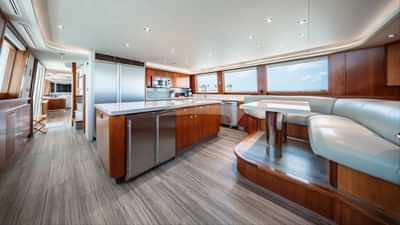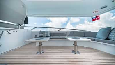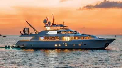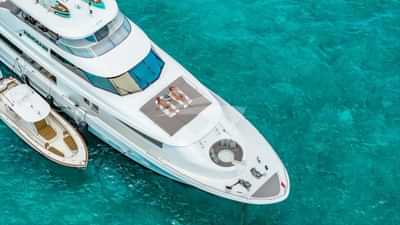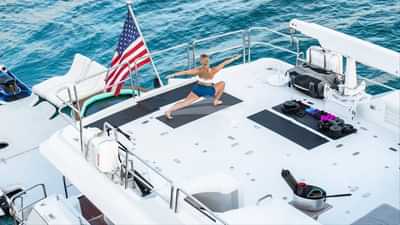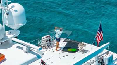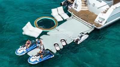 Amenities on board for the charter guests include Air Conditioning, BBQ, Beach umbrella, Library, Big game fishing gear, Light fishing gear, Ice maker, Jacuzzi on deck, Outdoor audio system, Special diets, Stabilizers At Anchor, Sun pads, Sun loungers, Swim platform, TV outdoor, TV saloon and Wi-Fi.