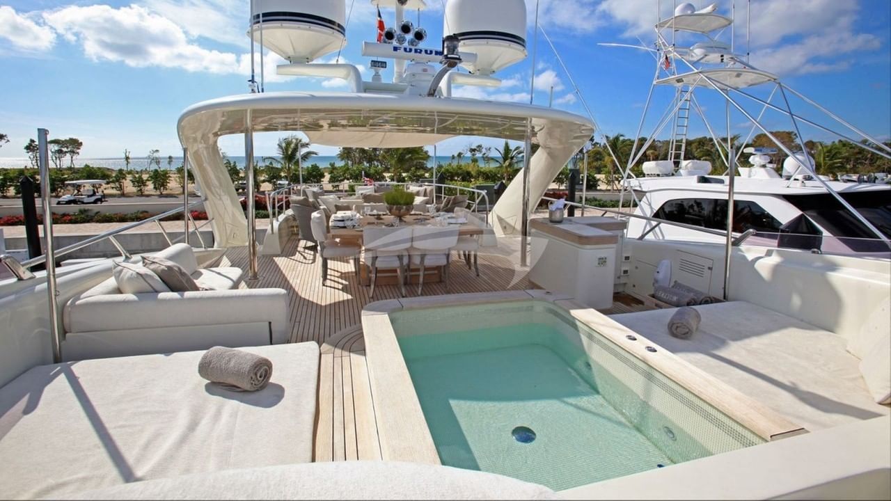 Amenities on board include Air Conditioning, Light fishing gear, Jacuzzi on deck, Satellite TV, Stabilizers At Anchor, TV primary cabin, TV saloon and Wi-Fi.