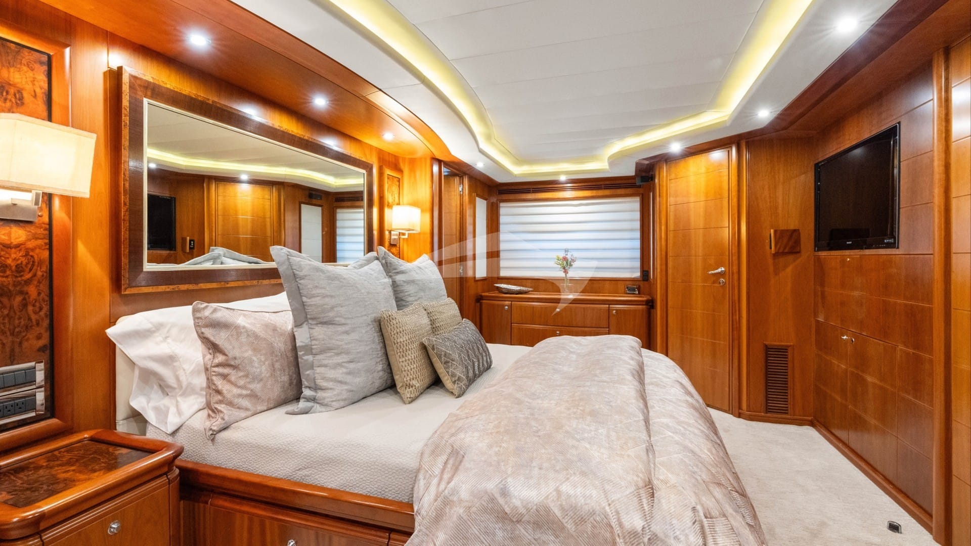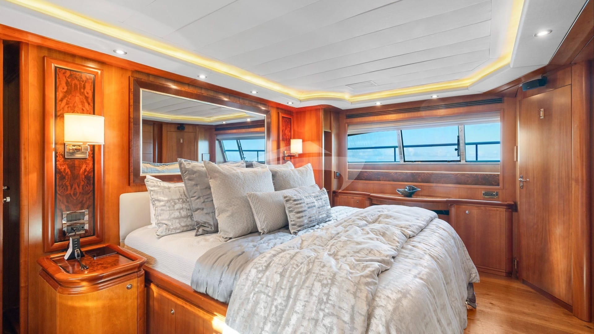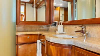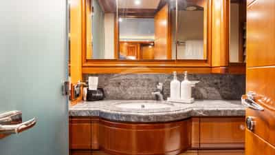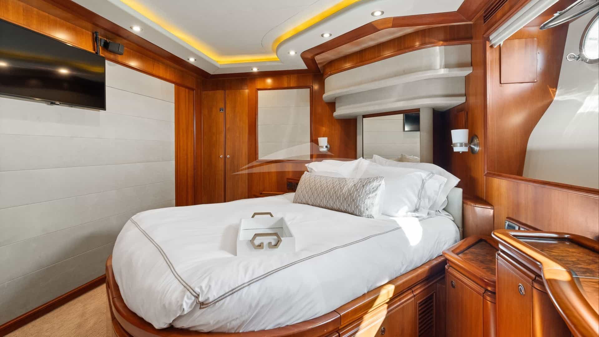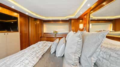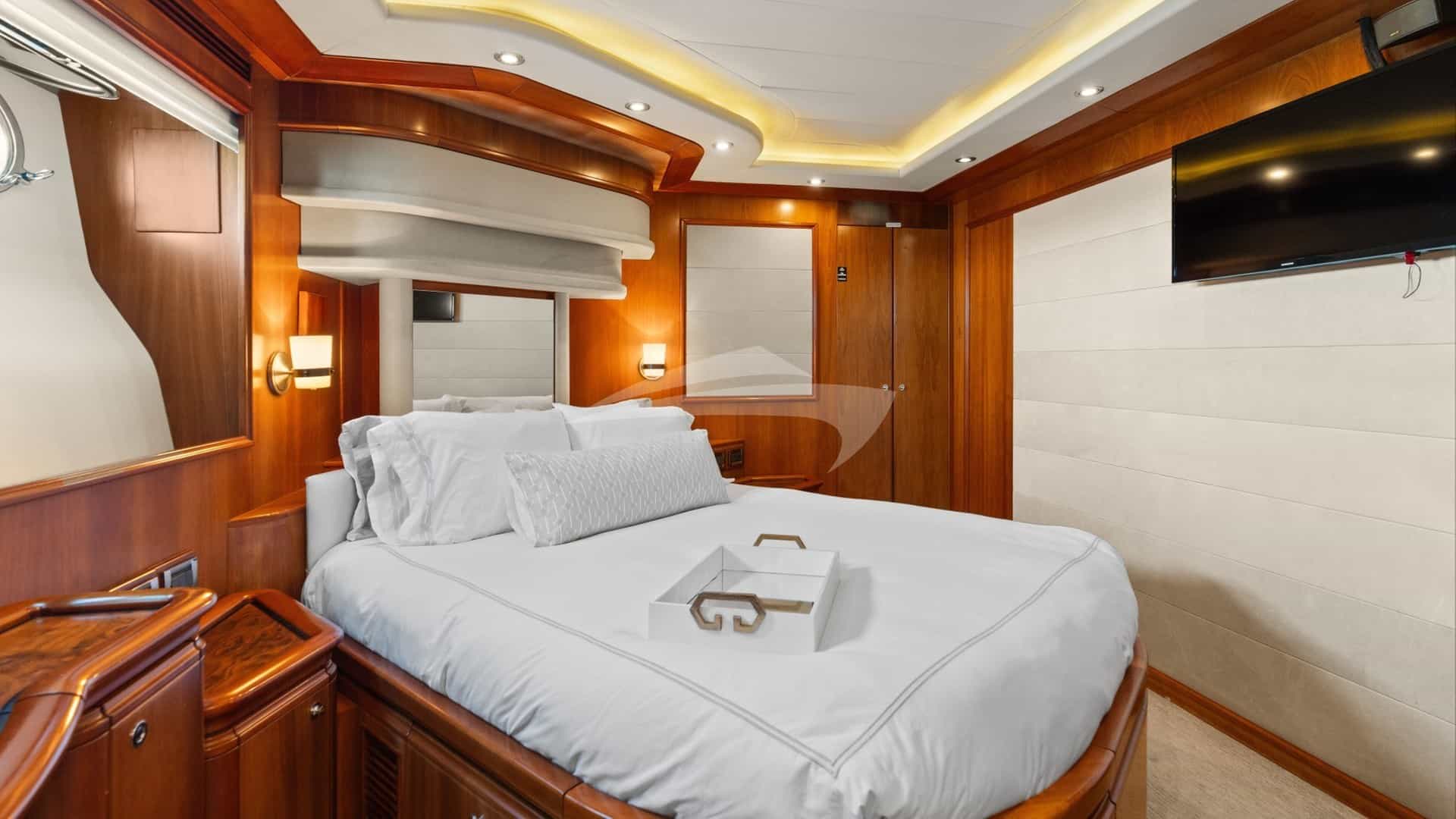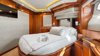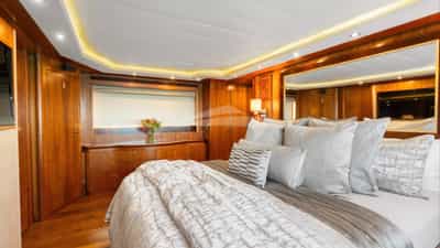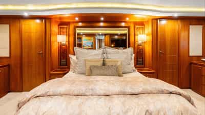 The guest cabins comprise a primary suite with a king size bed and en-suite bathroom facilities located on the deck, a VIP suite with a king size bed and en-suite bathroom facilities, a cabin with a queen size bed and en-suite bathroom facilities and a cabin with a queen size bed and en-suite bathroom facilities.