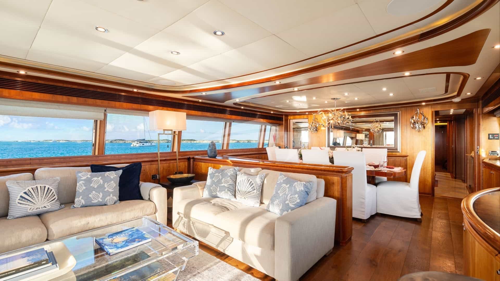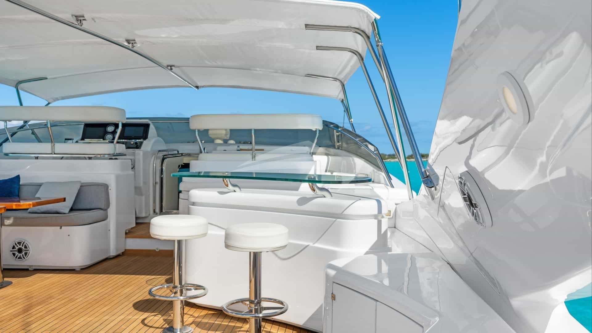 Amenities on board for the charter guests include Air Conditioning, Big game fishing gear, Light fishing gear, Stabilizers At Anchor, Sun pads, Sun loungers, Swim platform, TV all cabins and Wi-Fi.