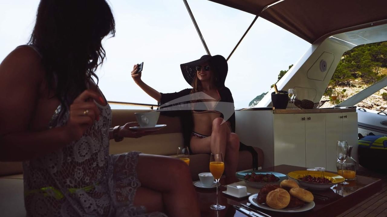 Amenities on board include Air Conditioning, BBQ, Outdoor shower, Indoor audio system, iPod dock, Outdoor audio system, Satellite TV, Sun pads, Swim platform, TV all cabins, TV saloon and Wi-Fi.