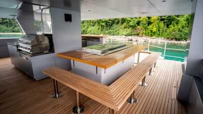 Amenities on board for the charter guests include Air Conditioning, BBQ, Big game fishing gear, Light fishing gear, Sun pads, Swim platform and Wi-Fi.