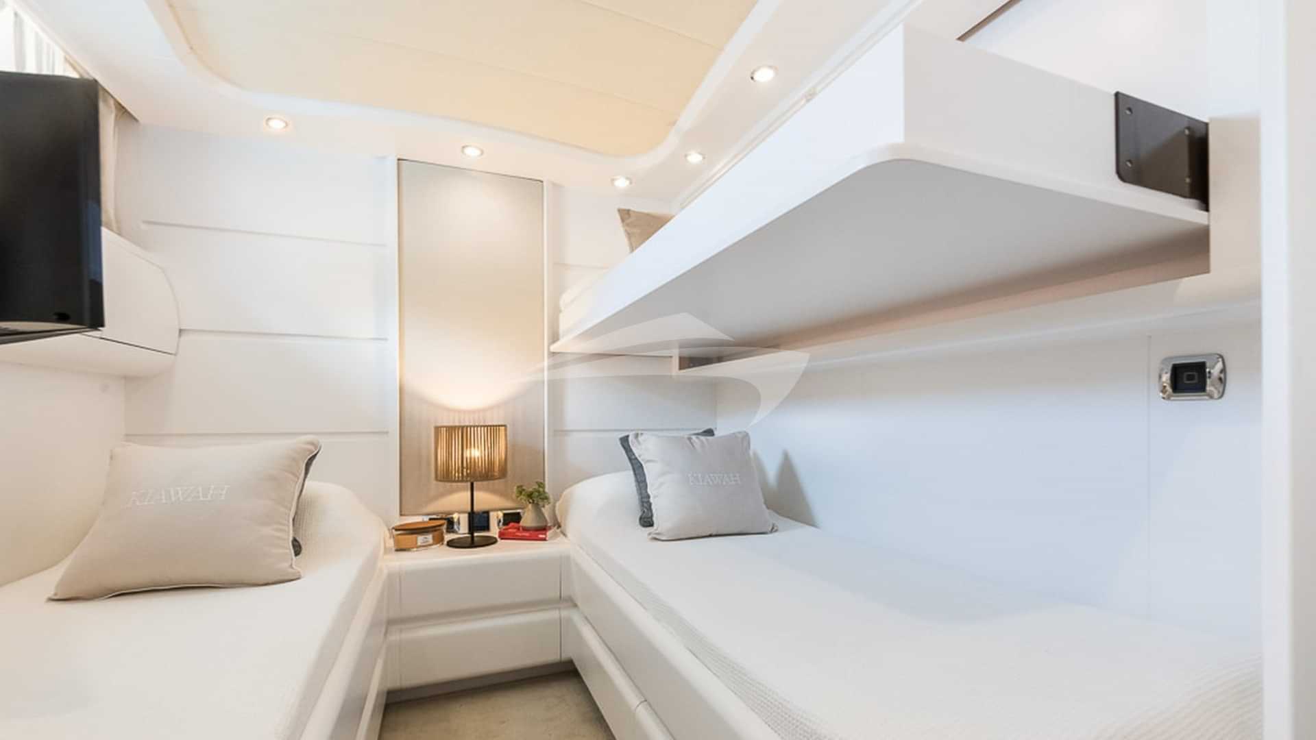 客舱包括一间带一张特大号床和连接浴室设施的主套房、一间带特大号床和连接浴室设施的贵宾套房以及两间带一张单人床、一张铂尔曼床和连接浴室设施的客舱。
