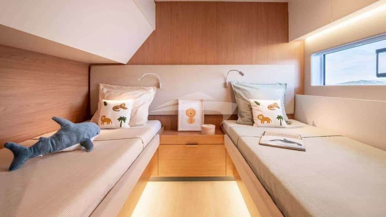 客舱包括一间带一张大号床和连接浴室设施的主套房、3 间带大号床和连接浴室设施的小木屋以及一间带两张单人床和连接浴室设施的小屋。