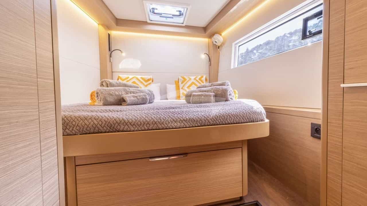 客舱包括一间带大号床和连接浴室设施的主套房、3 间带大号床和连接浴室设施的小屋以及一间带双人床的小屋。