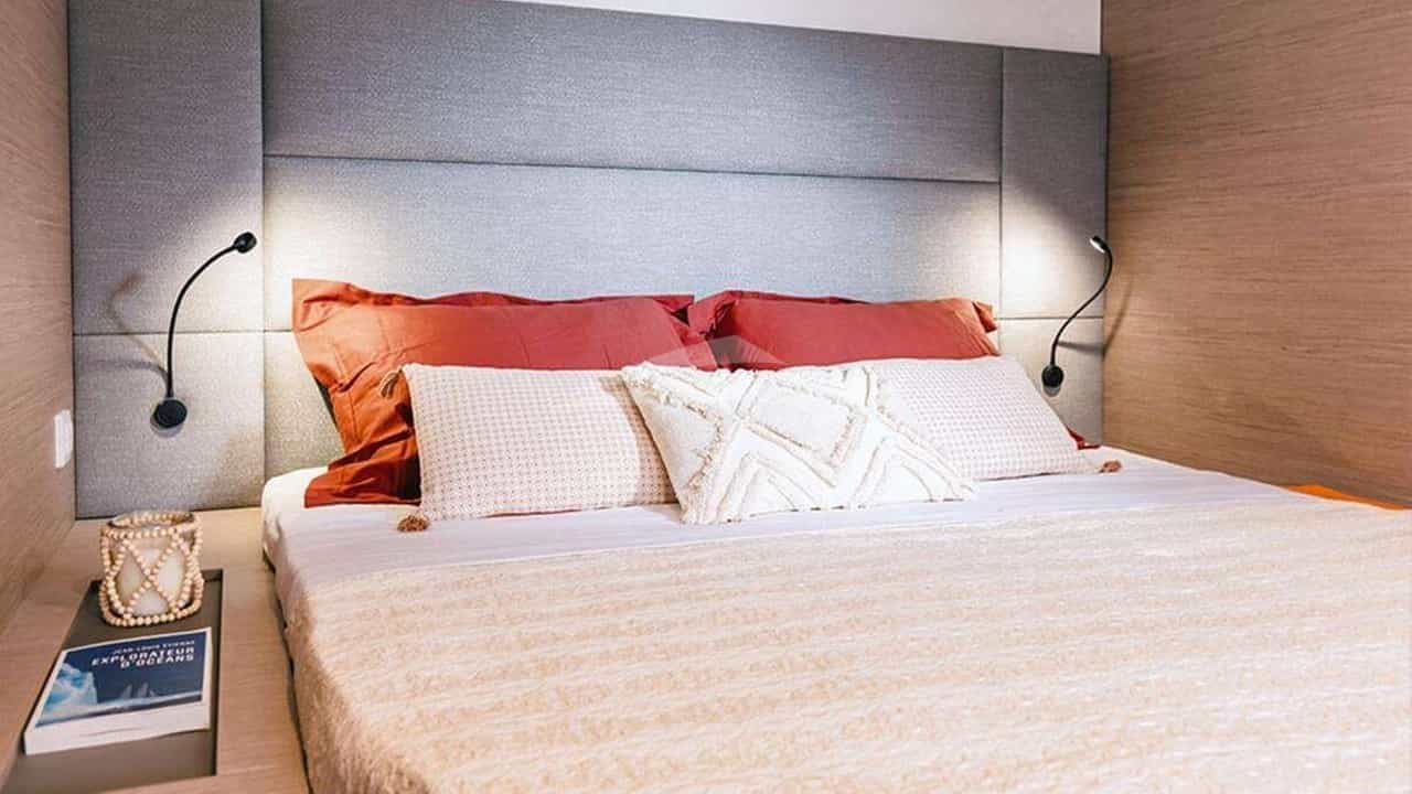 客舱包括一间带一张双人床和连接浴室设施的主套房以及 4 间带双人床和连接浴室设施的小木屋。