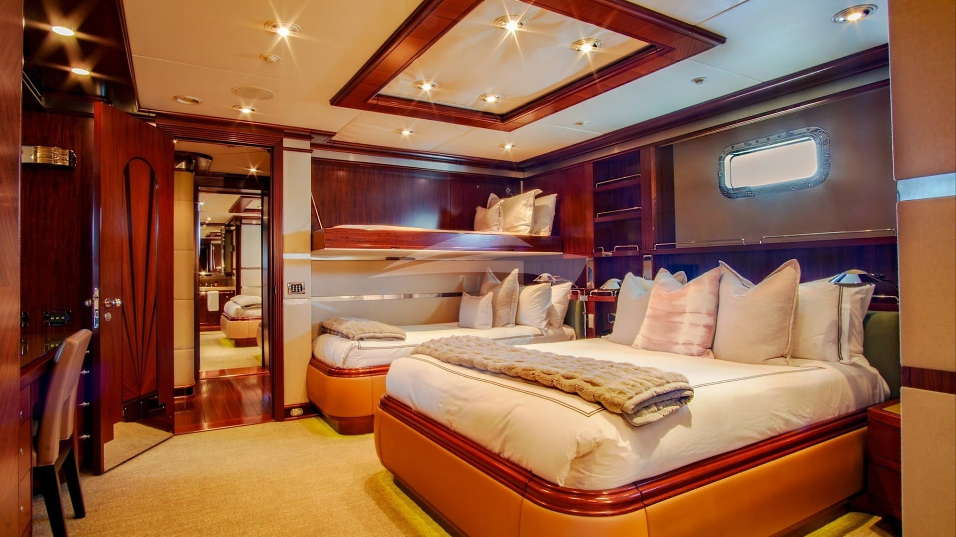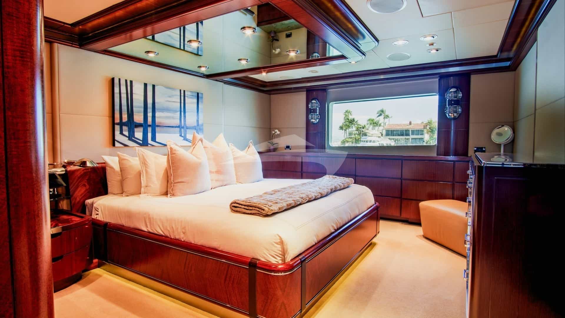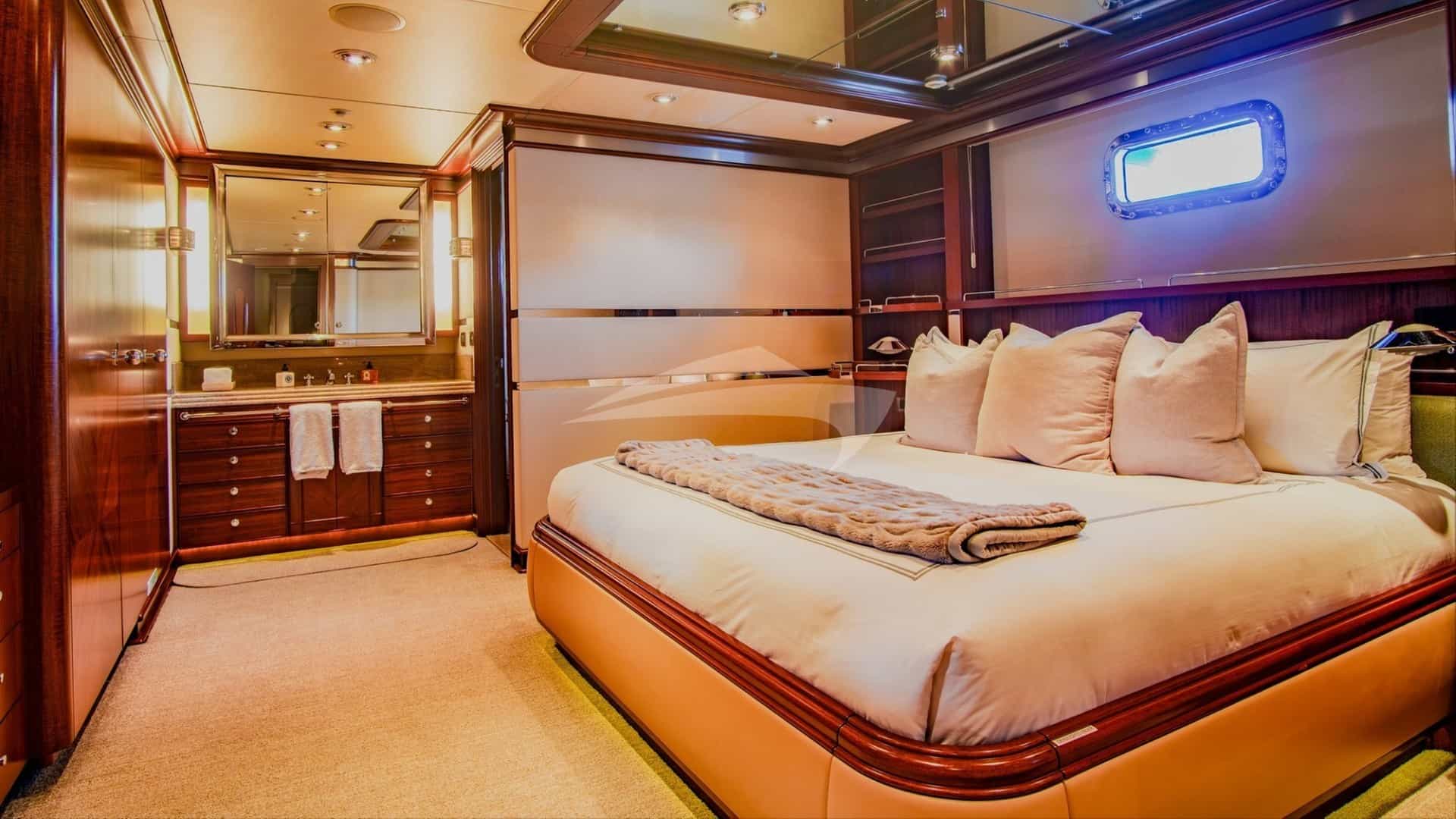 客舱包括一间带特大号床和连接浴室设施的主套房、一间带一张双人床和连接浴室设施的小屋以及两间带连接浴室设施的客舱。