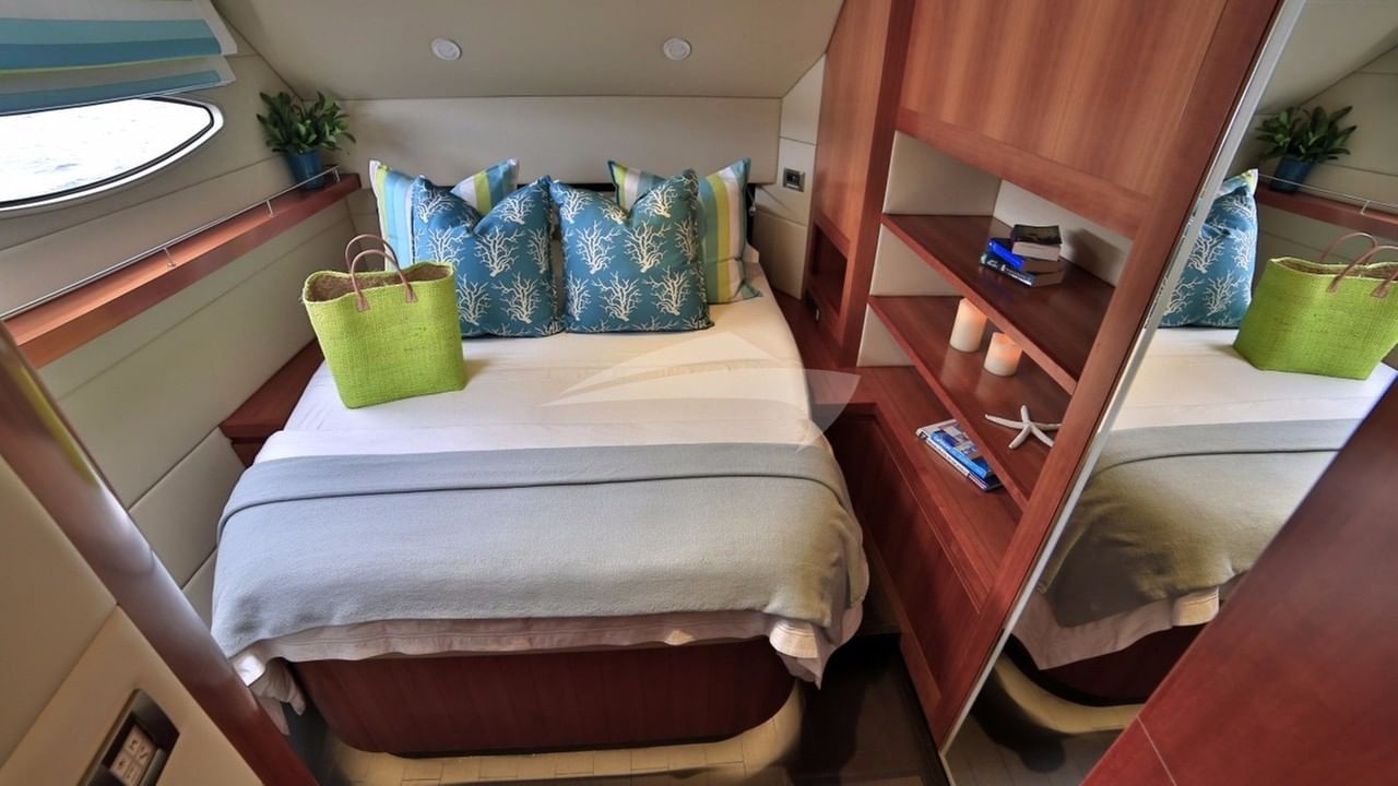 客舱包括一间带一张特大号床的主套房和位于船尾甲板下方的连接浴室设施、3 间带大号床和连接浴室设施的小屋以及一间带两张单人床和连接浴室设施的小屋。