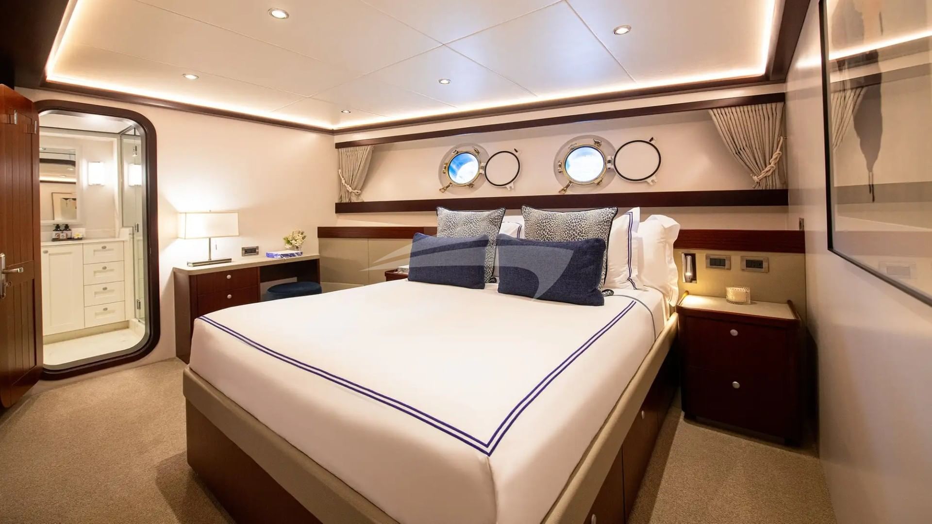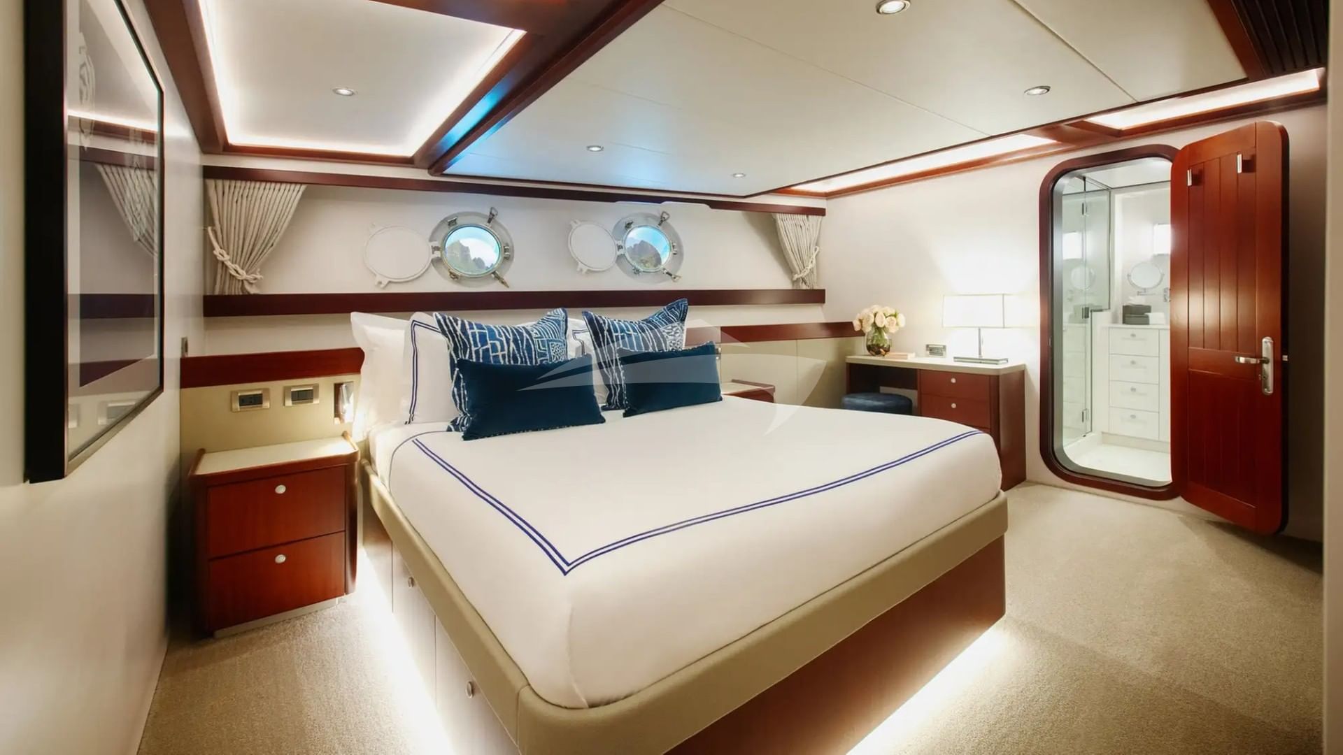 客舱包括一间带一张双人床和连接浴室设施的主套房、4 间带双人床和连接浴室设施的小屋以及一间带两张单人床和连接浴室设施的小屋。