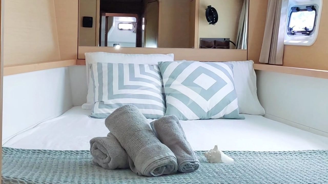 客舱包括2间主套房,配有一张大号床和位于船尾的连接浴室设施,以及一间配有大号床和连接浴室设施的小屋。